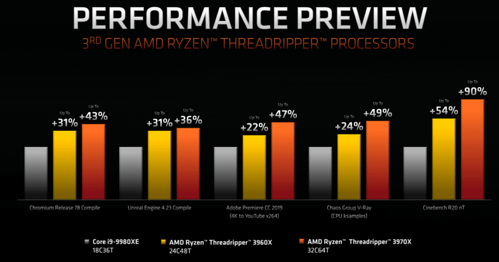 AMD Zen 2 Threadripper 24 core 3960X & 32-Core 3970X show up to 54% & 90% performance gains over Intel i909980XE