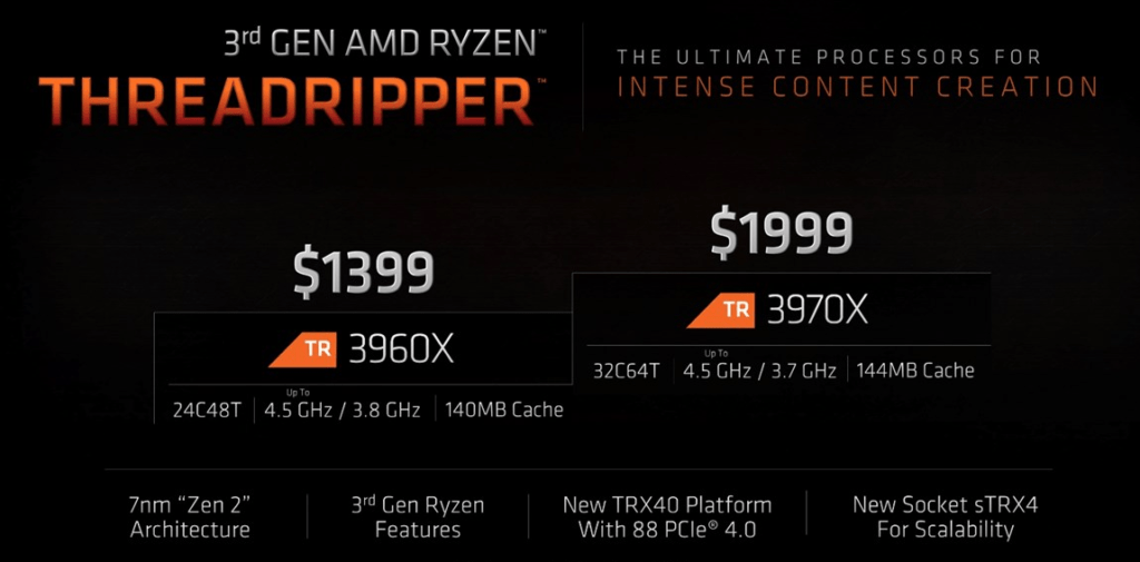 AMD says that the Threadripper 3960X or 3970X will ship on November 25th, and it has indicated that the processors will be priced at $1,399 and $1,999 respectively.