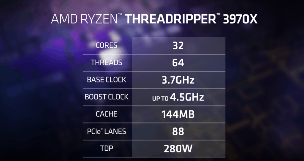 The Threadripper 3970X ups the stakes with 32 core and 64 threads, base/boost clocks of 3.7GHz and 4.5GHz respectively, and 144MB cache.