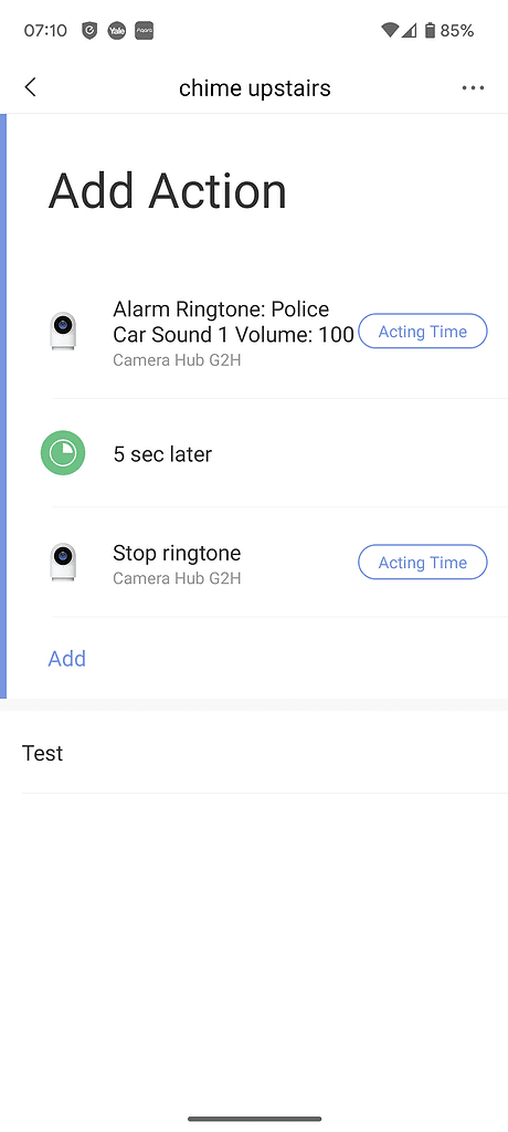 The first thing I did was to set up an automation that would trigger the alarm notification on my M2 Hub in my living room and the G2H Hub I have upstairs. You will need to set it up to trigger the alarm, then have a delay for X seconds, and then switch it off. I didn’t do this at first, and the alarm tone remained on permanently.