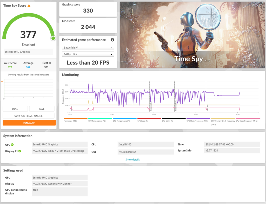 - TimeSpy: 377 Total, 330 Graphics, 2024 CPU