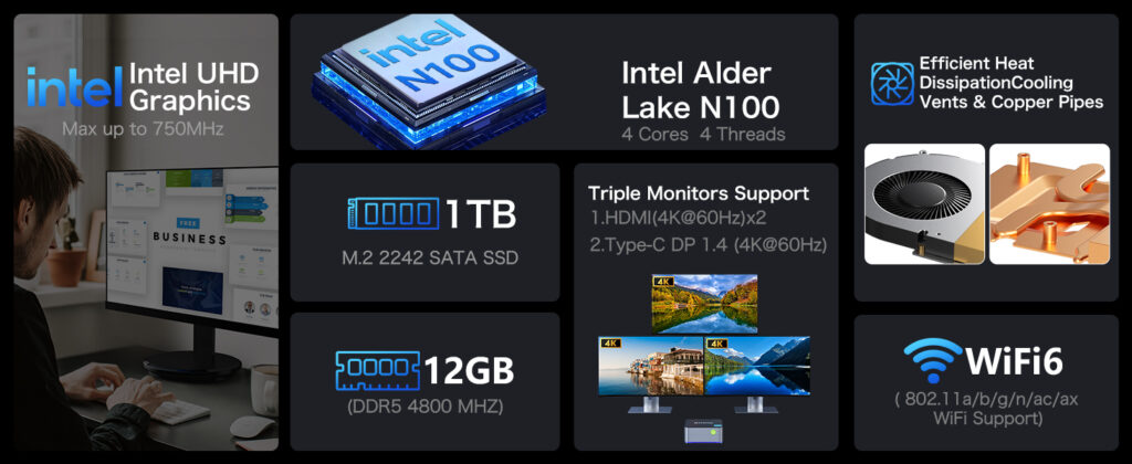 - 4K DUAL SCREEN DISPLAY - Mini desktop computer is equipped with upgraded Intel Graphics(max 1000MHz), supports 4K video playback and AV1 decoding, connect the pc with a projector as a home theatre, enjoy a variety of entertainments. Two HDMI 2.0 ports allows you to multi-task efficiently on two 4K@60Hz displays