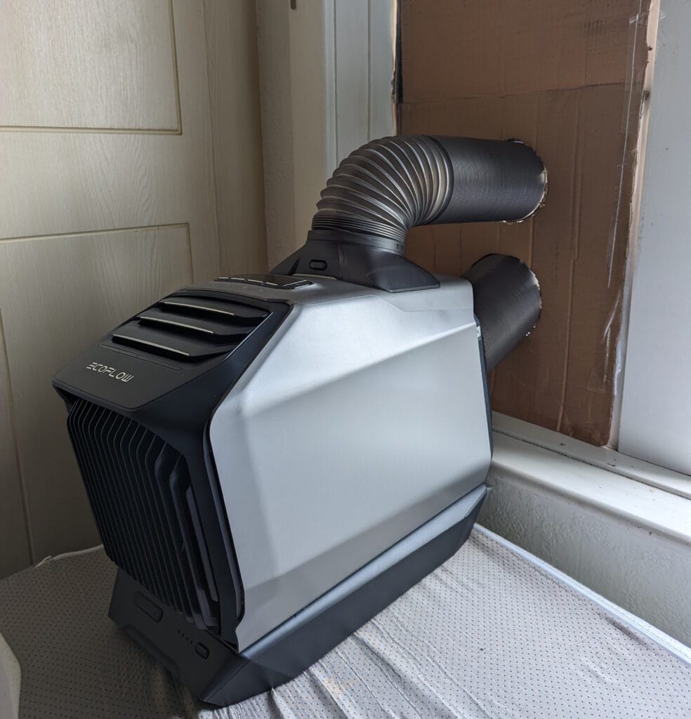 I later reviewed the EcoFlow Wave 2, which is compact with a 5100 BTU cooling capacity. This is not designed for home use but for off-grid living like caravans, boats and vans. However, the 5100 BTU cooling capacity is just enough for the spare bedroom I sleep in when I struggle to get to sleep. This is 2.5m wide, 4.5m long, and 2.5m high and I had to create a makeshift window seal and vent using some cardboard.