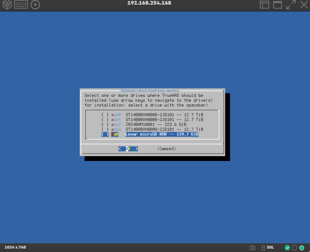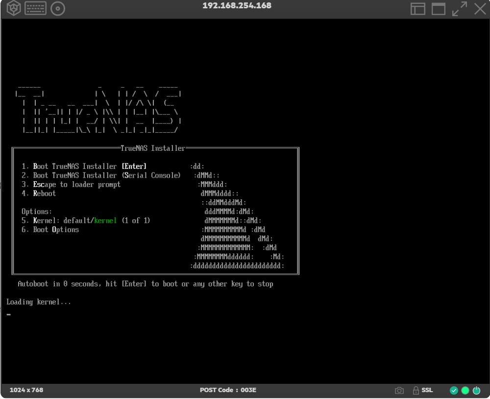 With the bootable USB fitted to one of the external USB ports, the TerraMaster loading up the TrueNas installation screen without any need for me to touch the BIOS settings.