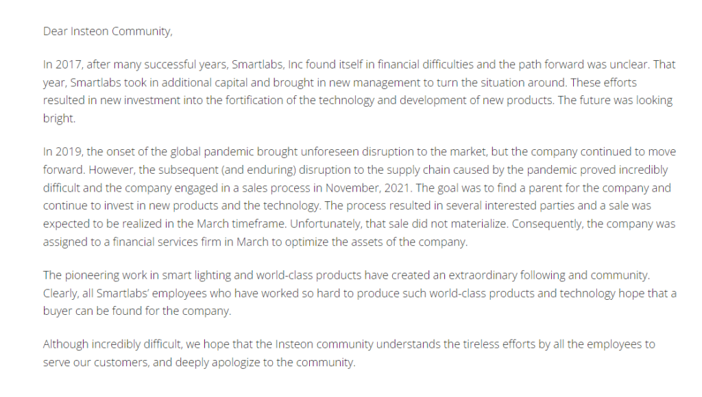 Update 2: Confirming what we already knew, Insteon has formally ceased trading and has posted a notification on the website. Users are also being contacted with a Important Notice to Creditors.