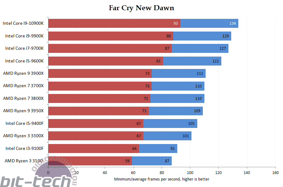 There is a massive advantage with Intel here, 27% higher results for the minimum FPS then 20% for average.