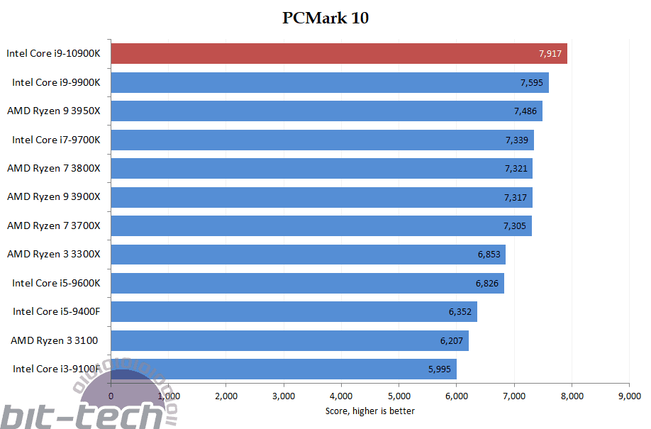 The Intel Intel Core i9 10900K comfortably sits at the top of PCMark 10 with a result that is 8% higher than the Ryzen 9 3900X.