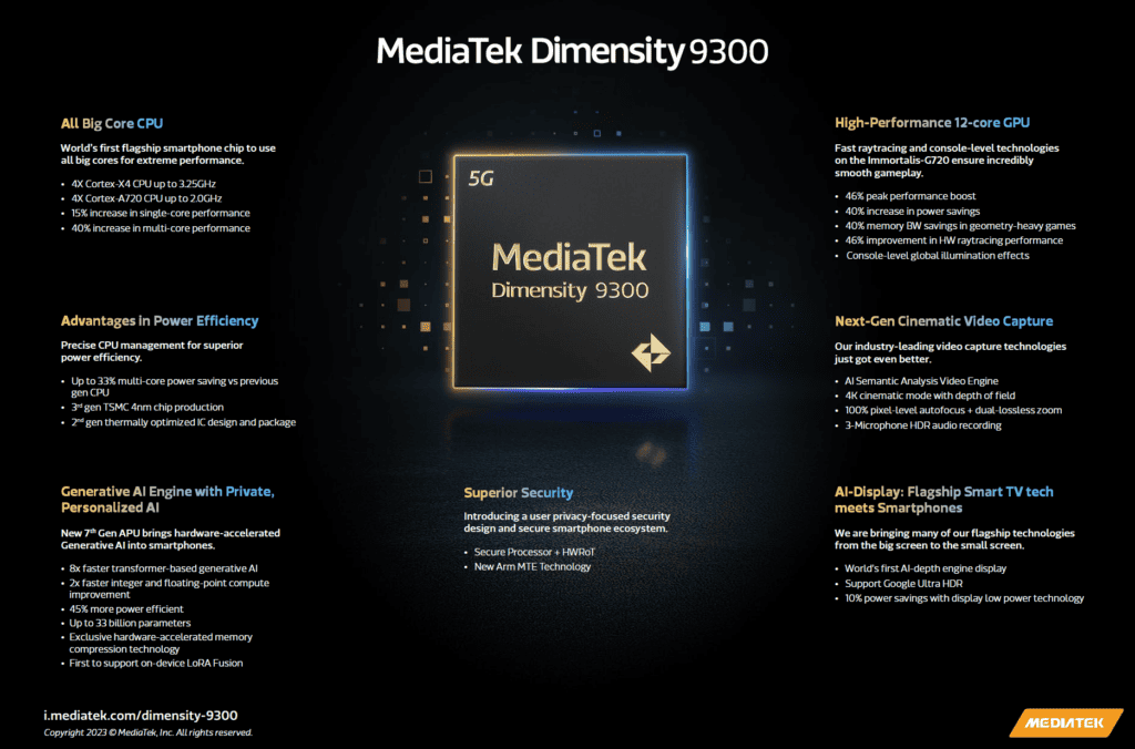 Connectivity is also upgraded on the Dimensity 9300 with the latest 5G, Wi-Fi 7, and Bluetooth 5.4 capabilities. It incorporates MediaTek’s 5G UltraSave 3.0+ technology for improved power efficiency. The chipset has an integrated secure processor and supports new Arm MTE technology to protect user privacy and security.
