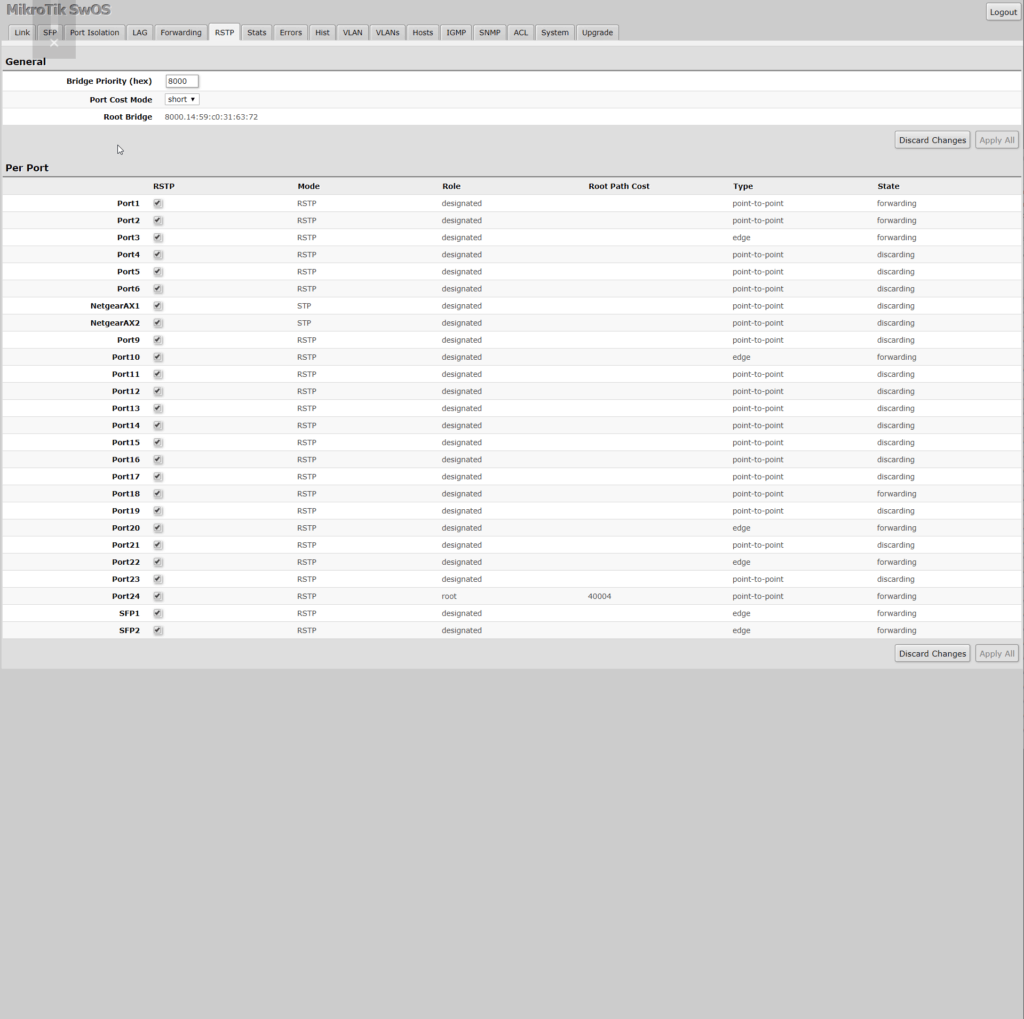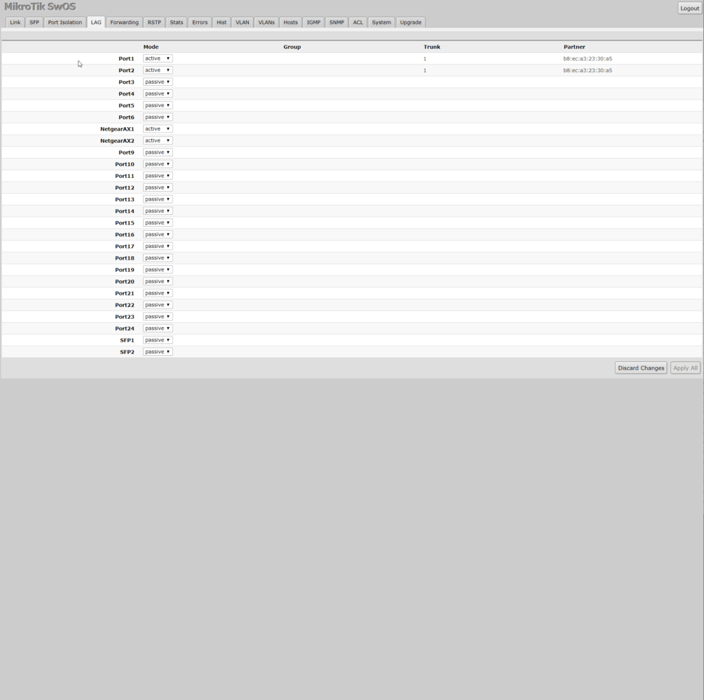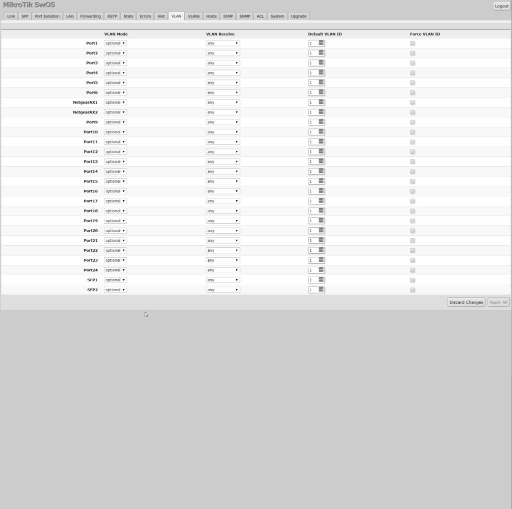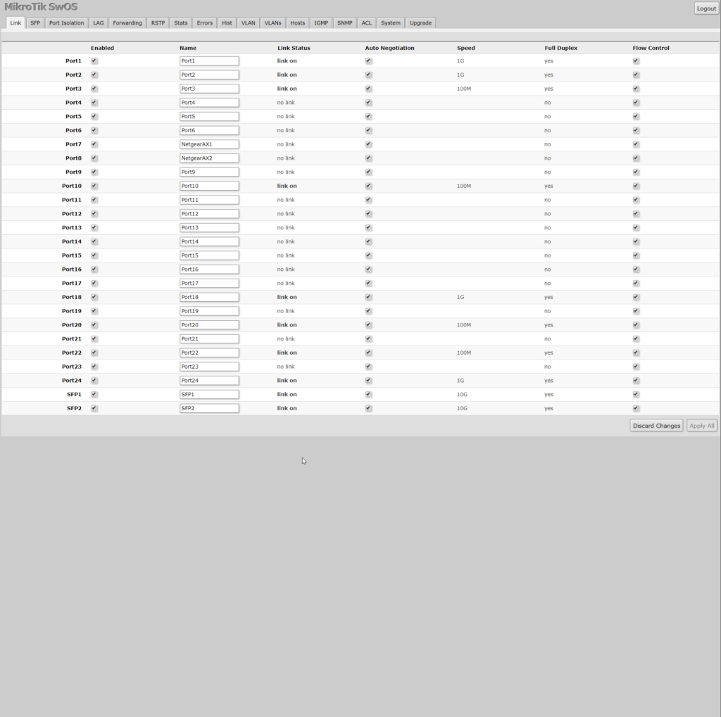 This sort of works out of the box, plugging my SFP cables in provided network connectivity to both my server and PC immediately. I used it like this for a couple of weeks but noticed some weird issues with my network, it particular my IP scanner couldn’t see the MikroTik, and my Zyxel Nebula POE switch was being reported as offline even though it was working.