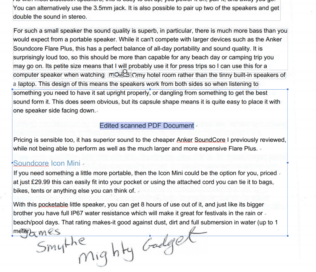 The accuracy is dependant on the quality of text in the first place. I printed off one of my recent reviews, then wrote my name on the bottom. I then scanned it in and ran the OCR. For the printed text, PDFelement did almost a perfect job accurately converting nearly all of the text. In the middle of the document it did get a little confused with the word movies, but overall it did very well. If this was a very long document, it could save hours of work retyping it all up. Alternatively, you can edit the existing document adding new text or images.