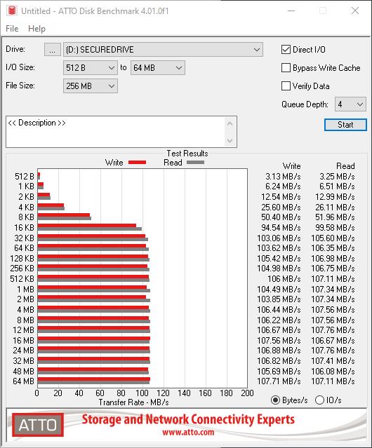 In CrystalDiskMark, drive performance is a bit below what you expect from a normal drive. Sequential read and right hit around 112MB/s, but the random 4Kb reads and writes drop off significantly. I assume this is due to the overhead introduced by the hardware encryption, but it is quite possible an issue with this benchmark on encrypted drives.