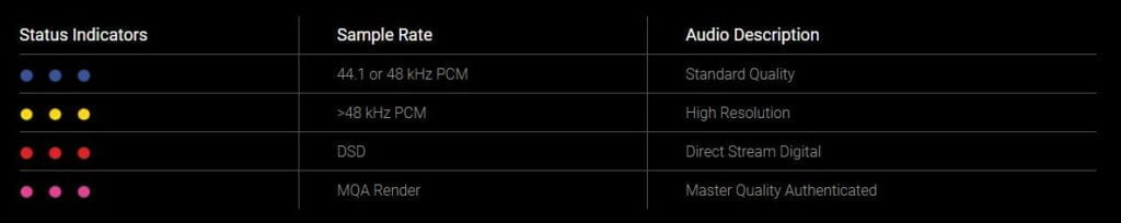 When you play music, the Onyx will detect the sample rate and indicate the quality via the indicators. Blue is the lowest, which is what you get with most basic streaming services, while pink is Master Quality Authenticated.