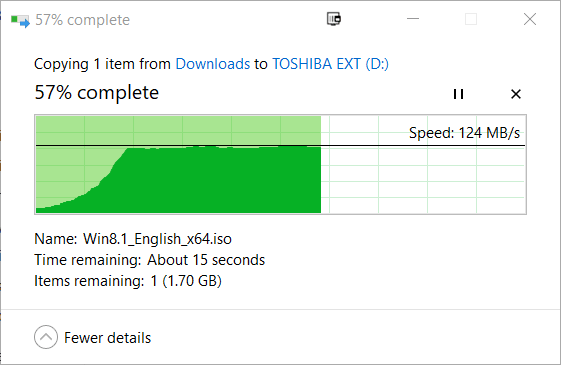 Connecting via USB3.0 I was able to transfer a Windows ISO at 125MB/s consistently. It is small file transfers where speed drops significantly, as is the case with all drives. Copying a website backup over which was 700MB but with 10,000 files the speeds were around 2MB/s-10MB/s.