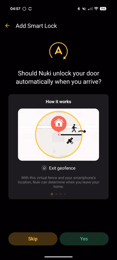 The initial setup uses the Nuki mobile app, which guides you through each stage with clear instructions and visual prompts. The app requests location permissions for automatic locking and unlocking features, though you can decline these if you prefer not to share your location data.