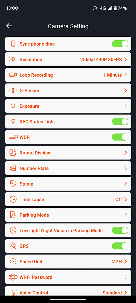 With the app connected, you can change all the settings that are available. This includes setting the resolution, loop length, exposure, WDR, low light settings, and more.