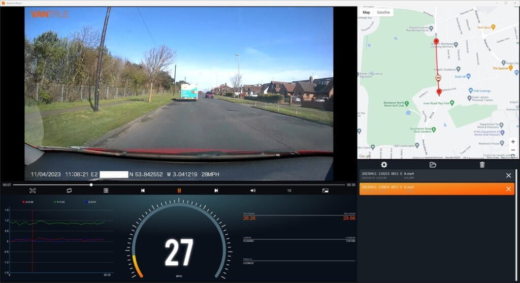 The stand-out feature of this camera is the built-in GPS, which then adds location speed data to the MP4 file. Then when you use the Vantrue mobile or Windows app to view the footage, you are shown the footage with the route and position of the car also plotted against a good map. The Windows application also shows a large dial showing the current speed then data on average speed and max speed. The video itself also shows the current speed.