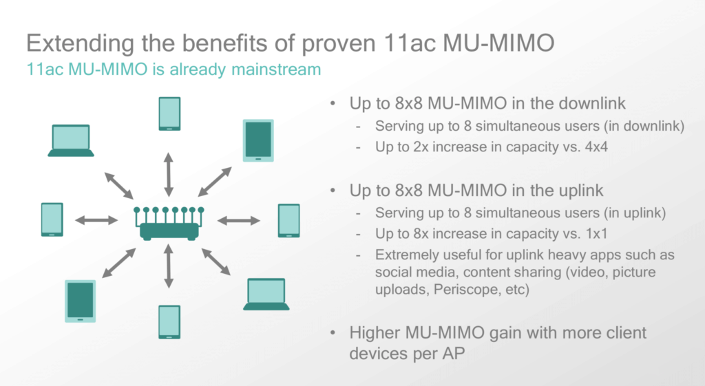 802.11ax’s new implementation allows multiple client devices to share the available streams from the access point for both download and upload. This combined with OFDMA should, in theory, allows multiple users to transmit at high speeds without interfering with one another simultaneously.